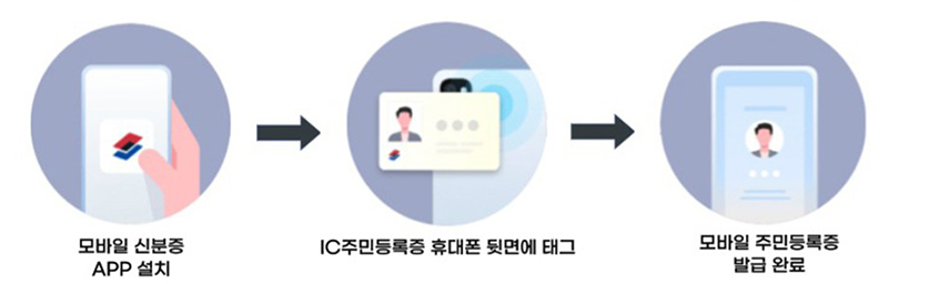 IC칩 내장 주민등록증 소지자는 주민센터 방문 없이 휴대전화에 주민등록증을 접촉하여 모바일 주민등록증을 직접 발급받을 수 있습니다.