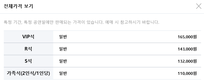 - VIP석: 165,000원 - R석: 143,000원 - S석: 132,000원 - 가족석(2인석 / 1인당): 110,000원