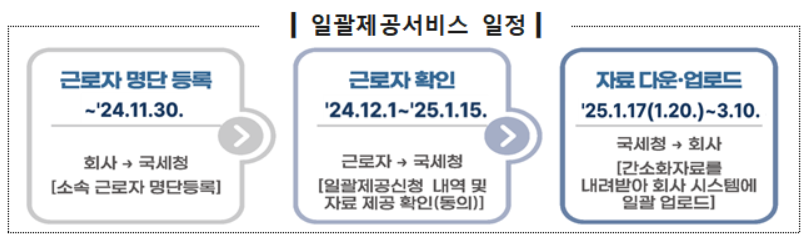 - 국세청은 2025년 1월 17일 또는 1월 20일에 자료를 제공하며, 회사는 3월 10일까지 홈택스에서 간소화자료를 내려받기 할 수 있습니다.